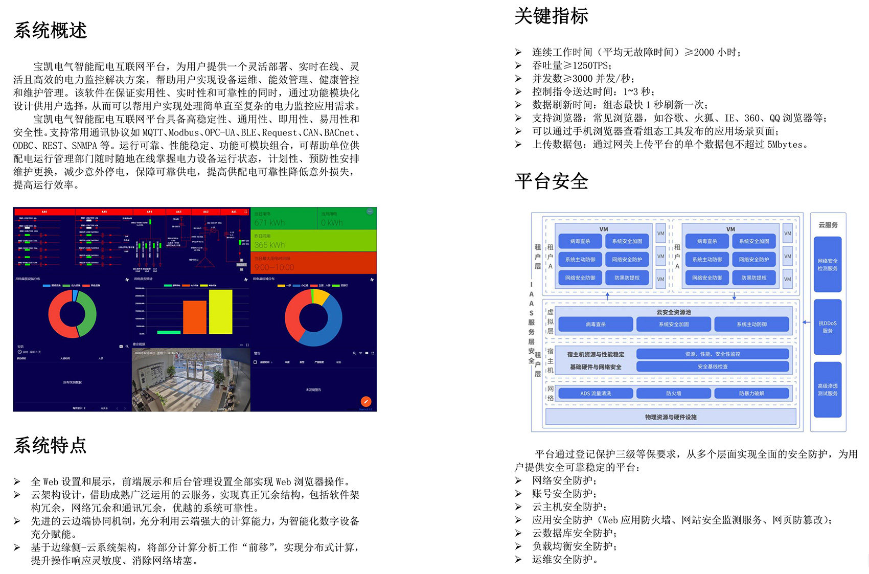 宝凯电气智能配电监控系统以计算机、通讯设备、测控单元为基本工具,可连接智能电力监控仪表、带有智能接口的低压断路器及其他智能设备,实现遥控、遥测、遥信功能(根据设备及用户需求同时可实现遥调功能),对系统各种运行开关量状态和电量参数进行实时采集和显示,可完整地掌握变配电系统的实时运行状态,及时发现故障并做出相应的决策和处理,保护一次设备,同时可以使值班管理人员根据变配电系统的运行情况进行负荷分析、合理调度,实现对变配电系统的现代化运行管理。