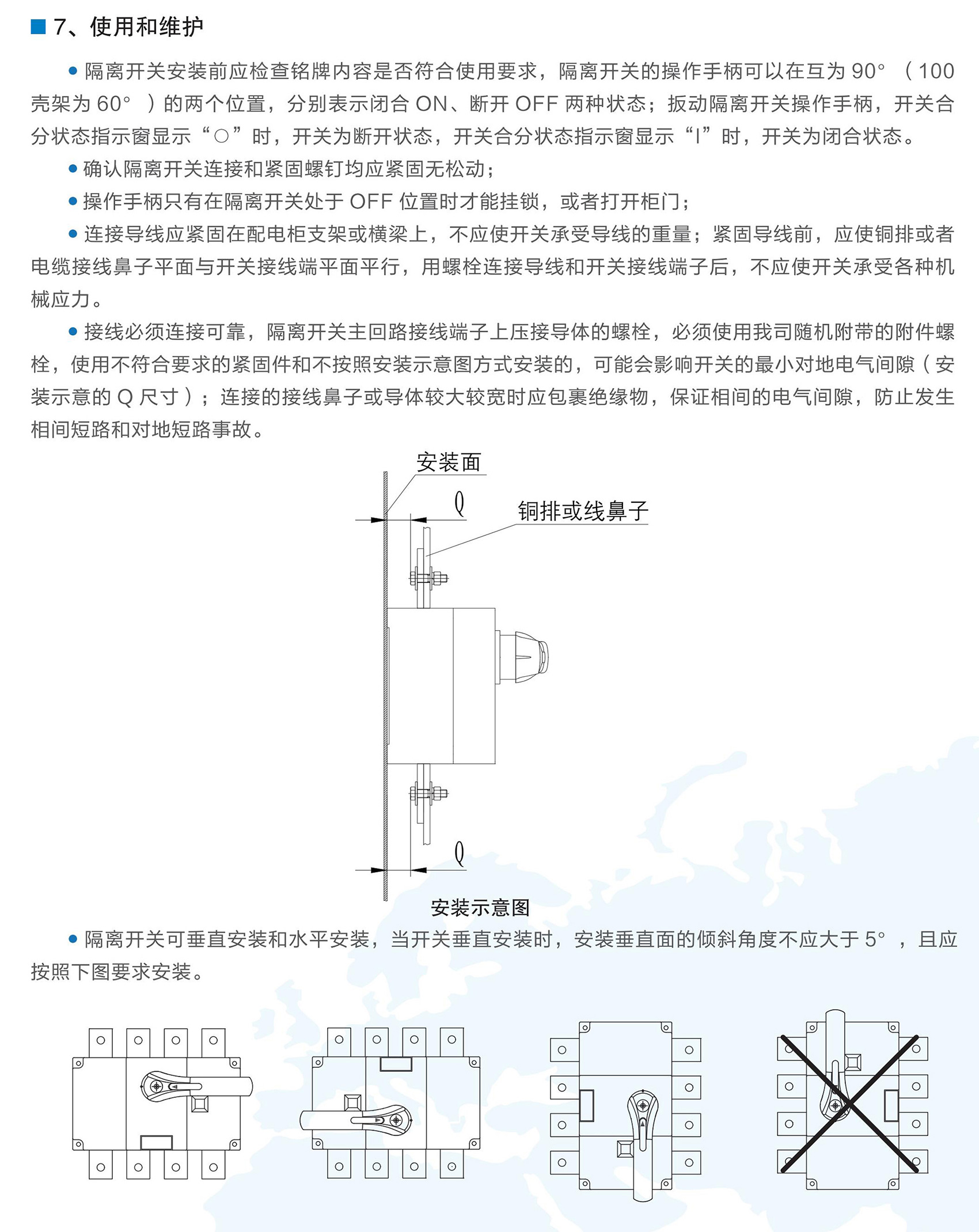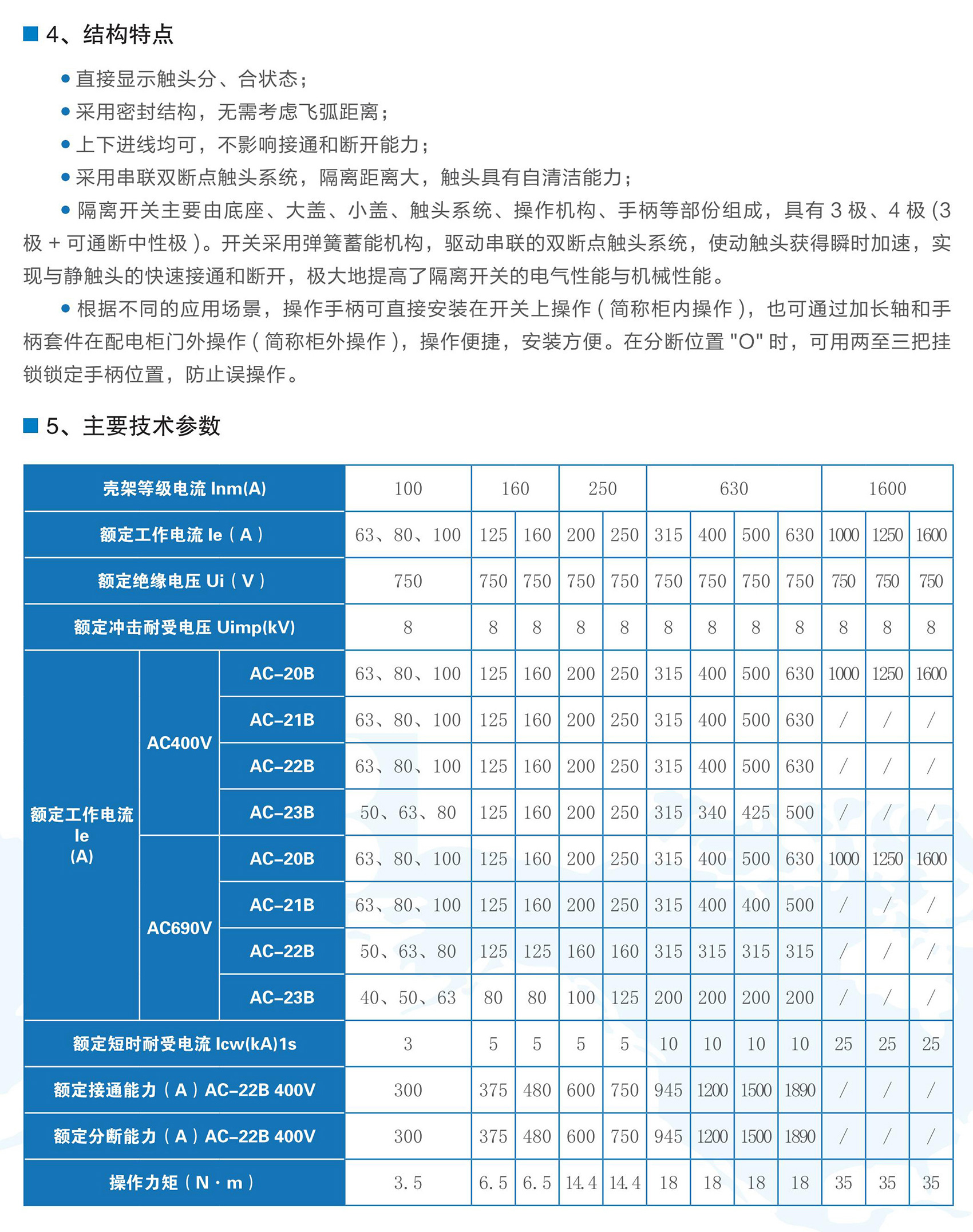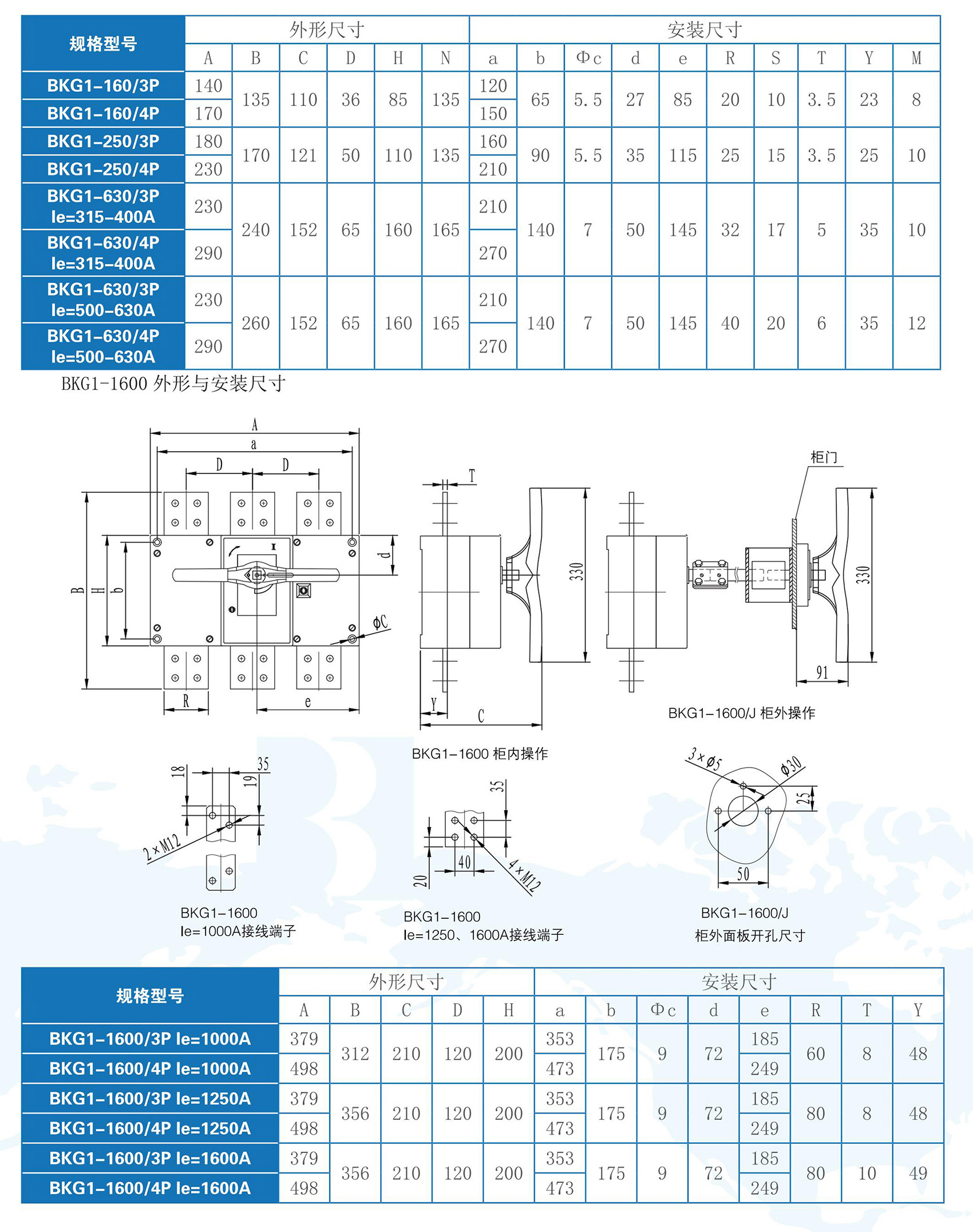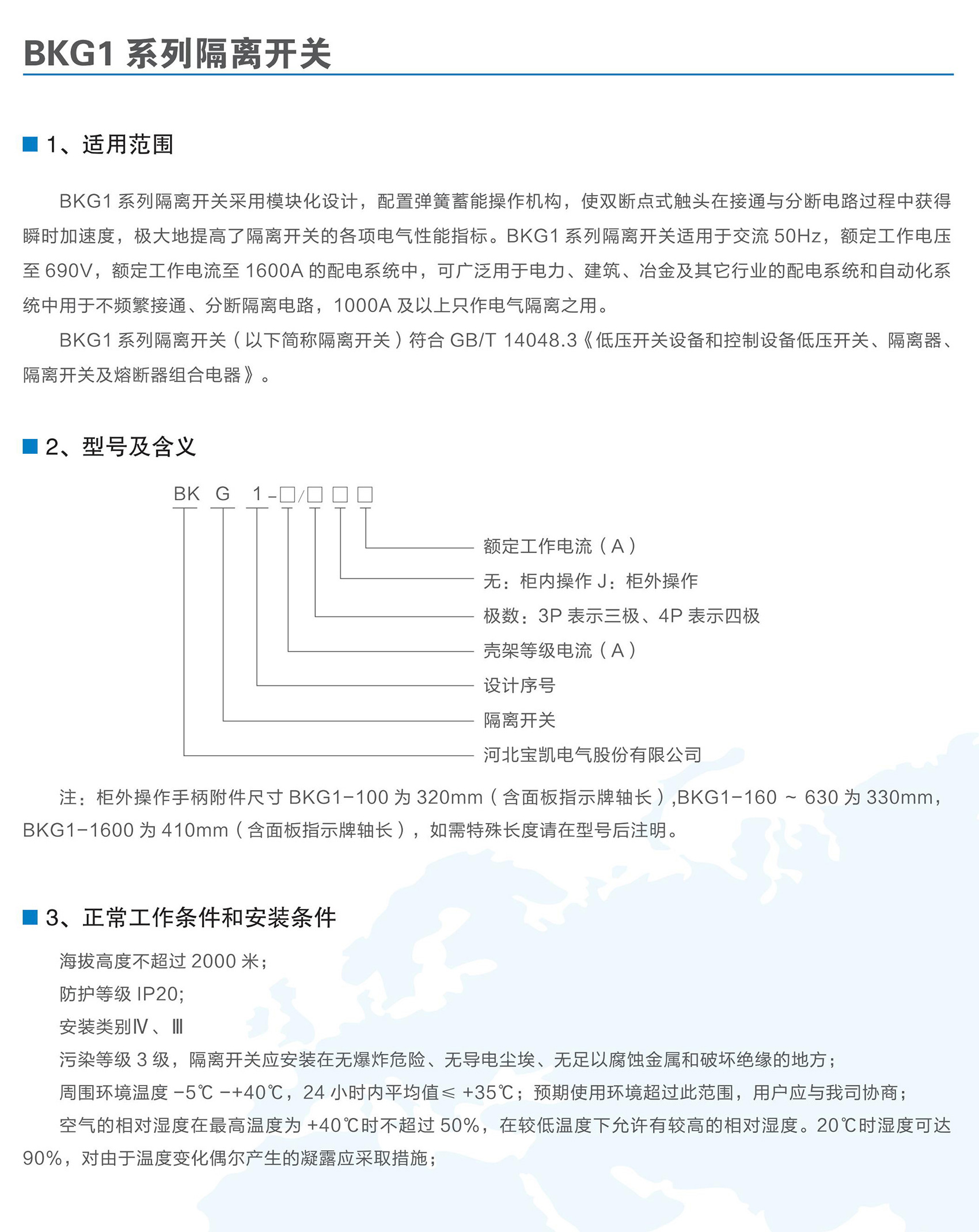 BKG1系列隔离开关适用于交流50/60Hz,额定工作电压至AC690V,额定电流为1600A及以下的电力系统中,可广泛用于电力、建筑、冶金及其它行业的配电系统和自动化系统中用于不频繁接通、分断和隔离电路之用,额定工作电流1000A及以上产品,只作电气隔离之用。BKG1系列隔离开关符合GB/T 14048.3《低压开关设备和控制设备低压开关、隔离器、隔离开关及熔断器组合电器》。